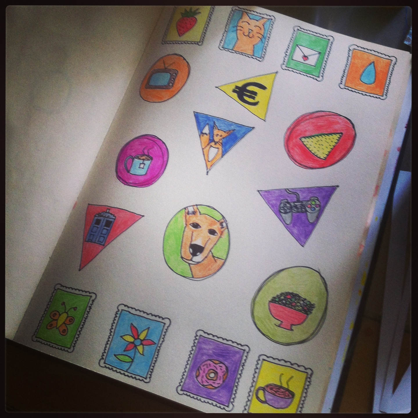 This is the going small assignment, where we had to fill small spaces with different things. I used as my theme, things from daily life. Like my pets, what I ate and did.